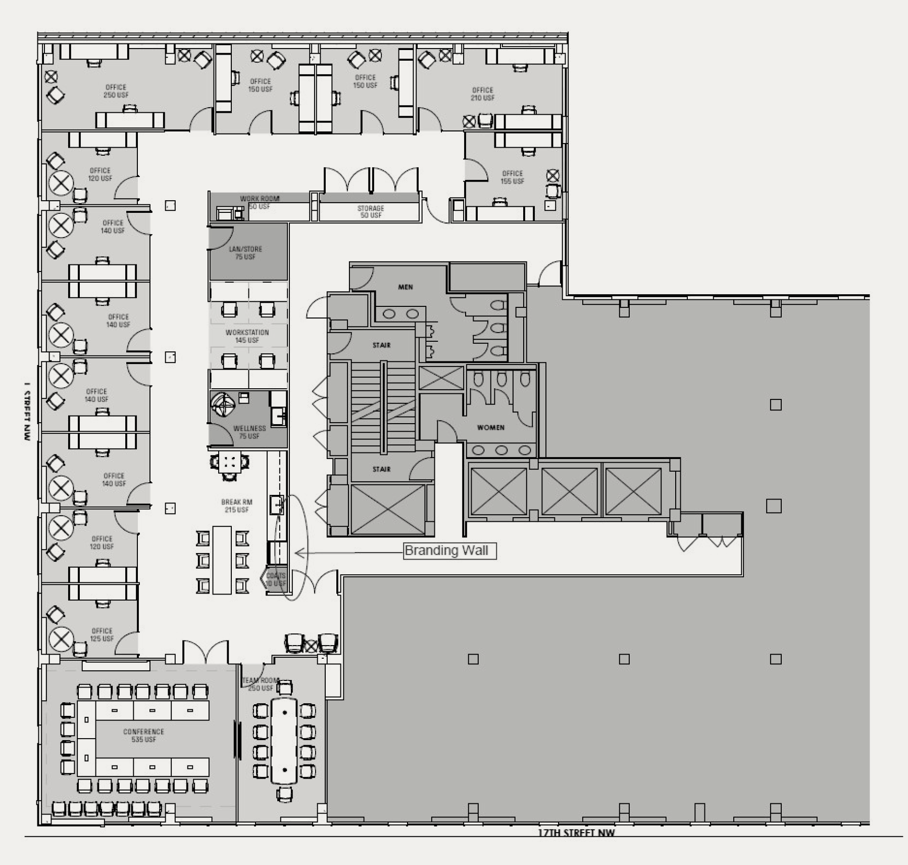 This corner office building recently underwent a $4.8 million renovation adding amenities attractive to DC's modern clients. The new, sleek client experience includes a chic lobby, a café-style client lounge known as The Hive, a new conference room, a fitness center, bike storage, and trendy new retail.